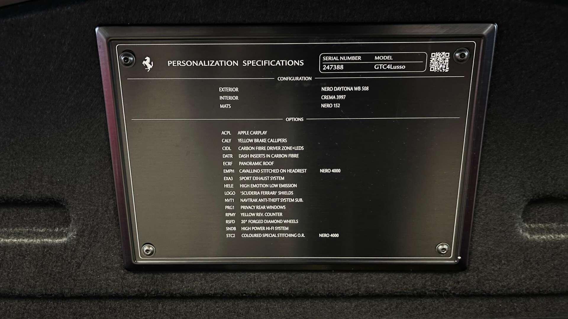 Welcome to V12 Automobil, where we're delighted to present this very well spec'd Nero Daytona over Crema Ferrari GTC4 Lusso which comes provided with full Ferrari service history and the remainder of Ferrari warranty of approximately 2 years. This very well looked after example comes boasting some fantastic factory options which include: Apple car play, Yelllow brake calipers, carbon fibre driver zone+LEDS, Dash inserts in carbon fibre, panoramic roof, cavallino stitch on headrests in nero, sports exhaust system, scuderia ferrari shields, navtrak anti-theft, privacy rear windows, yellow rev counter, 20" forged diamond wheels, high power hi-fi system, coloured special stitching O.R in nero and much more. V12 Automobil is an authorised and regulated company with the FCA:1033823. Every vehicle we offer is accompanied by an impressive award winning warranty, extendable up to 36 months complemented by complimentary UK breakdown cover for the entire duration. Seeking enhanced security? We offer insurance-approved security systems and trackers for your peace of mind. We accept part exchanges on all cars, for swift and accurate part exchange valuations please get in touch. We are Situated outside of the congestion zone and our dealership proudly boasts a stellar 5-star review rating ensuring a friendly, hassle-free and trusted buying experience. Enjoy nationwide delivery and flexible finance options with viewings available by appointment only. Give us a call today at 03301335108 to schedule a viewing or for more information.